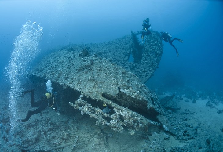The SS Dunraven had been traveling to Mumbai (then Bombay) when it hit the reef and sunk just off the tip of the Sinai Peninsula in 1876. Today, this 80-meter steam ship, torn in two pieces on the sea floor, is home to a rich variety of fish, which have made their home within the barnacle-encrusted hull. Divers here spot big schools of cardinal fish and goat fish, as well as moray eels and scorpion fish. It’s roughly a two-hour boat trip from Sharm el-Sheikh, and a dive here is often combined with Ras Mohammed National Park dives or with a Thistlegorm dive trip
