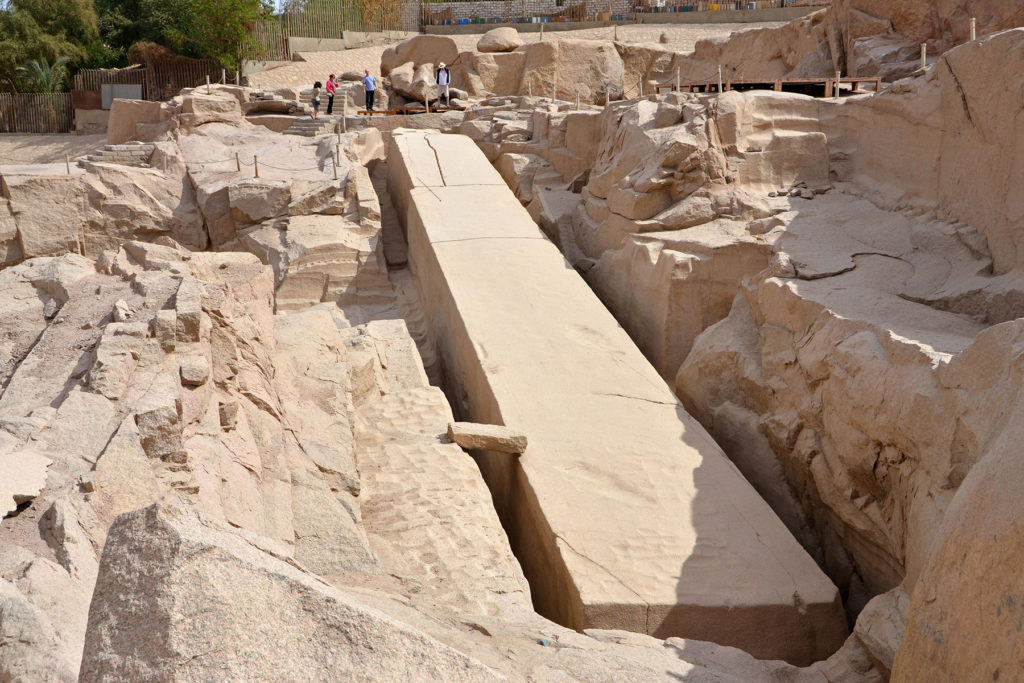 Aswan’s Northern Quarry is home to the famous Unfinished Obelisk — a 41-meter-long and four-meter-wide chunk of stone that was probably abandoned because of a crack in the rock. It’s estimated that if completed, the obelisk would have weighed 1,168 tons and would have been the largest ever hewn. On the surrounding rock faces, you can also see the many traces of the work of ancient stonecutters. The blocks here would have been detached from the rock by boring holes along a prescribed line, driving wedges into these, and then soaking the wedges with water to detach the block.