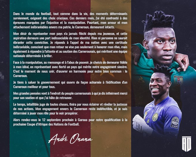 “I answer the call of my nation with an unshakeable certainty, aware that my return is not only to honour my dream, but also to meet the expectation and support of Cameroonians,” the keeper said.