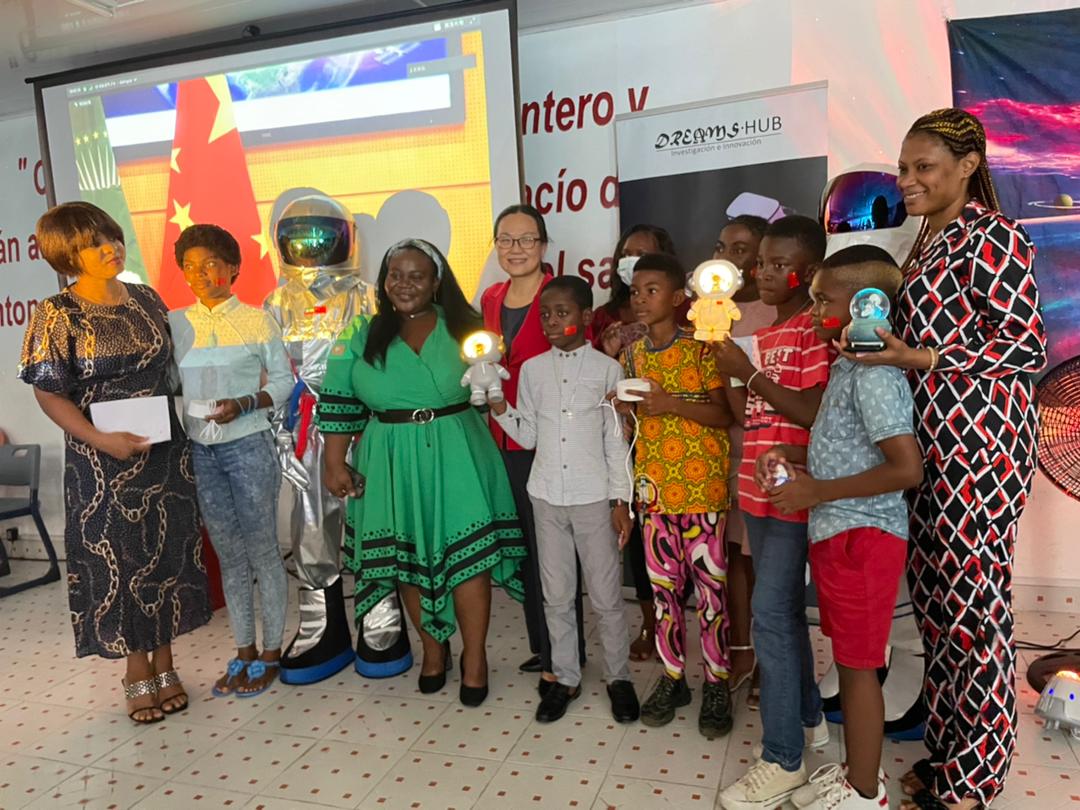 On the Equatorial Guinea side, the historic event was co-organised by the Chinese embassy in Malabo and the technology, entrepreneurship, research and innovation centre Dreams Hub, which hosted the meeting involving more than fifty girls and boys from its Crystal Eggs programme (girls and boys from 7 to 13 years old, who receive free education in ICTs, languages and values management). The event, which turned into a party, was attended by other young adults, managers, educators, dance groups, renowned artists, raffles and prizes.
