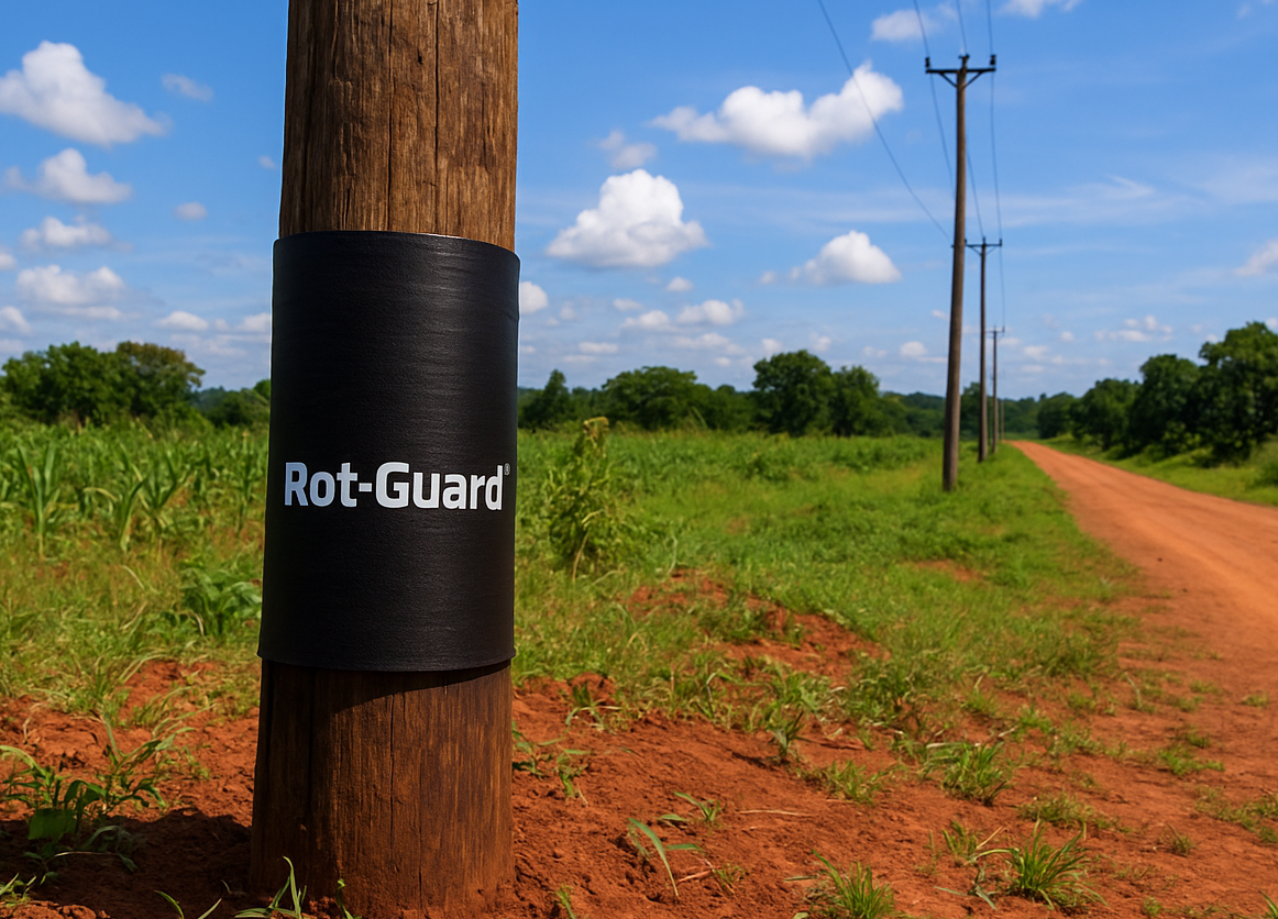 Rot-Guard™ sleeves are dual-layer heat-shrinkable barriers designed to protect the most vulnerable part of wooden poles: the ground-line, where contact with moisture, fungi, and termites accelerates degradation. The outer thermoplastic layer prevents water and oxygen infiltration, while the inner bituminous layer seals the wood, forming an impenetrable protective barrier. Despite the growing use of steel and concrete, wood remains preferred in many African regions due to its lower cost, ease of installation, and smaller environmental footprint. Yet its limited durability has long challenged utility companies.