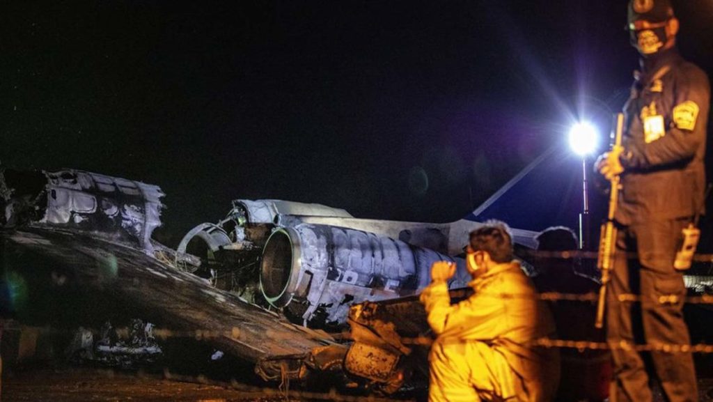 Firefighters rushed to the end of the runway where the aircraft was engulfed in flames, dousing it with chemical foam, an airport authority statement said.